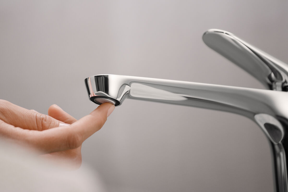 Der Strahlregler der Armatur ist gut durchdacht. Anders als bei typischen Armaturen wurde zwischen dem Strahlregler und dem Rand des Auslaufs absichtlich Platz gelassen. Dieses offene Design verhindert, dass sich Wassertropfen am Auslauf festsetzen. Wenn Tropfen zurückbleiben, sammeln sie sich auf dem Silikonregler, der leicht zu reinigen und bei Bedarf kostengünstig zu ersetzen ist. Das Ergebnis sind weniger Kalkablagerungen, eine einfachere Wartung und eine Armatur, die über eine längere Zeit in gutem Zustand bleibt.